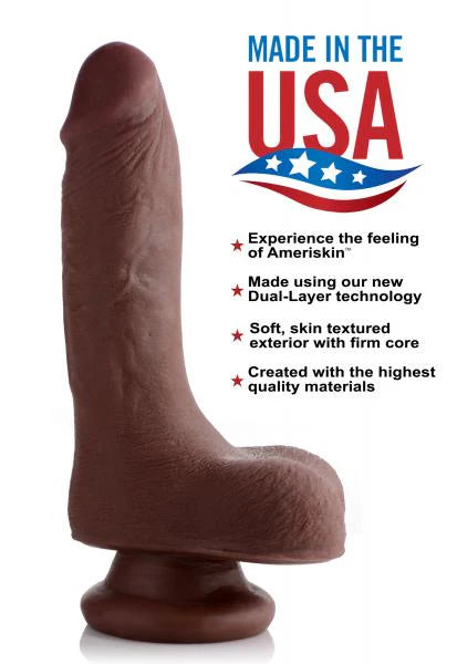 The perfect pecker for penetrative pleasure! This gorgeous dildo will deliver orgasmic ecstasy with its precise representation of an average sized erection. Savor every ridge and ripple in the realistic penis and scrotum, designed to please your eyes and your body! The strong suction cup base can be mounted to a smooth, hard surface for hands-free penetration, but it also makes this dong strap on compatible for partner use. Not too big and not too small, this beautiful brown shaft is just right! In order to provide the most realistic dildos on the market, USA Cocks utilizes an innovative dual layer technology to create the Ameriskin material. The firm inner core and soft, detailed exterior produce a lifelike look and feel that is unrivaled. Made in the United States of America with the highest quality materials, Ameriskin is phthalate free for a completely body safe experience. Measurements: 8 inches in total length, 6 inches insertable, 1.75 inches in diameter. Material Thermoplastic Elastomers TPE. Color Brown.