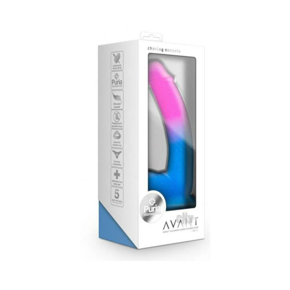 Modern, stylish, and beautiful - meet the Avant Chasing Sunsets! This unique, handcrafted dildo has a brightly-colored gradient effect and subtle glitter sparkle to bring some magic to your playtime. The strong suction cup base can be secured to any flat, clean surface for hands-free play, or is harness compatible for partnered fun! Chasing Sunsets has silky smooth UltraSilk and is made of Puria platinum-cured silicone, making it body-safe and free of phthalates, paraffins, fragrance, and latex. Beautiful to behold and made with your pleasure in mind, time to start Chasing Sunsets!Beautiful Gradient Effect and Subtle Glitter SparkleMeticulously Handcrafted and RealisticSturdy Suction Cup Base. Strap On CompatiblePure Platinum Cured Puria Silicone. Ultrasilk® Smooth. Water Based, Hybrid Lube Safe7.75 Inches Length x 6 Inches Insertable x 1.25 Inches Width
