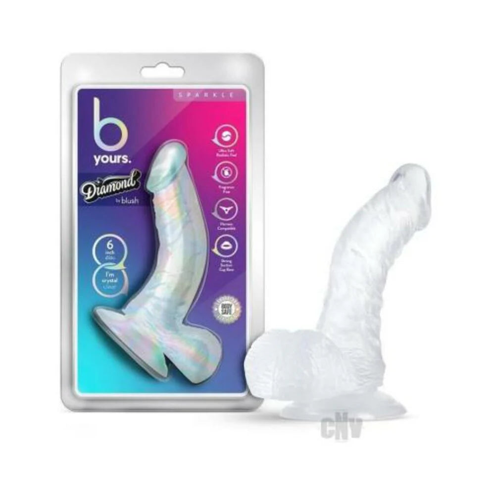 Blush B Yours Diamond Sparkle is a gorgeous, realistic dildo with a sturdy suction cup base that holds to any smooth flat surface for solo time. It`s also harness compatible for partnered fun! Sized for comfort and sculpted to look and feel lifelike, Sparkle is the perfect addition to your collection. It has a clear coloring so you are better able to watch yourself during play and has a subtle curve for perfect G Spot stimulation! Made of TPE, Quartz contains no phthalates, latex, fragrances, or paraffins. Indulge in your desires with B Yours Diamond. Responsibly Made By Blush Of TPE. We Care About Your Health And Wellness And Are Mindful Of What We Provide For Your Body. Lab Tested andamp; Verified To Contain No Phthalates, BPA, Fragrances Or Other Unsafe Compounds In Compliance With Prop65 andamp; REACH Product Safety Requirements. Silicone, Water Based and Hybrid Lube Safe