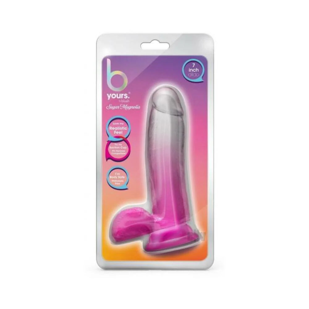 B Yours Sugar Magnolia is a beautiful and realistic dildo with a sturdy suction cup base that holds to any smooth flat surface for solo time! Or partner up for strap-on harness fun! This gorgeous design has a gradient effect that truly brings some color to your playtime. This exceptional dildo is perfectly sized and a perfect addition to your collection! Sugar Magnolia is made of non-porous PVC and contains no fragrances, phthalates, paraffins or latex. Responsibly Made By Blush. We Care About Your Health And Wellness And Are Mindful Of What We Provide For Your Body. Lab Tested andamp; Certified In Compliance With Prop65 andamp; REACH Product andamp; Material Safety Requirements. We Recommend Cleaning With Soap And Water Before And After Use. Silicone, Water Based, Hybrid Lube Safe