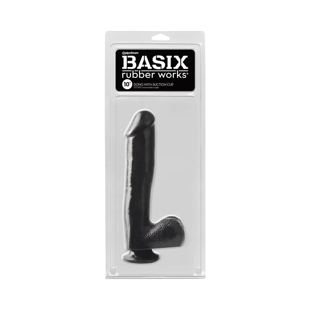 PVC dong with balls and suction cup. Measures 10 inches long, 8.75 inches insertable, 2 inches diameter.