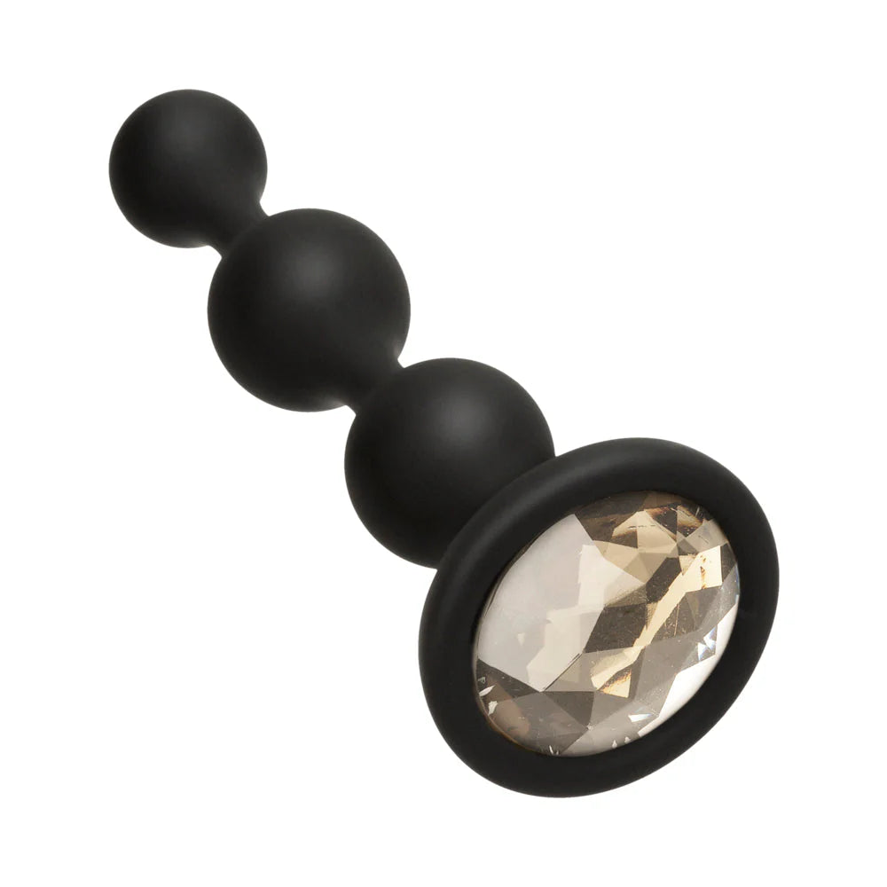 Three moderately sized anal beads made of premium health-grade silicone allow for comfortable extended wear. A shiny silver gem contrasts against the black, safely flared, base. Booty Bling is insertable up to 3.75in with a .75in diameter. Also available with Purple or Pink gem.