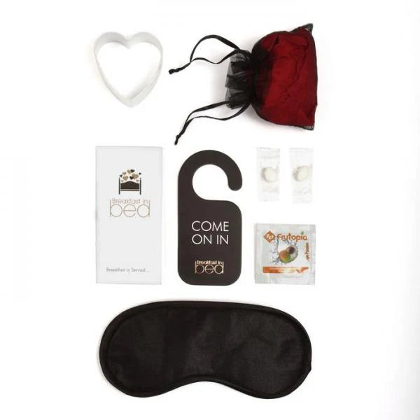 Everyone knows Breakfast in Bed is a real treat, but this kit has all of the ingredients to make this dining experience the best one yet! Features: Do Not Disturb Door Hanger, Black Satin Blindfold, Heart Shaped Cookie Cutter, Mini Bag of Rose Petals, 2 Breath mints 1 ID Frutopia Lubricant Sachet, Breakfast Menu containing helpful ideas and suggestions for a glorious morning!