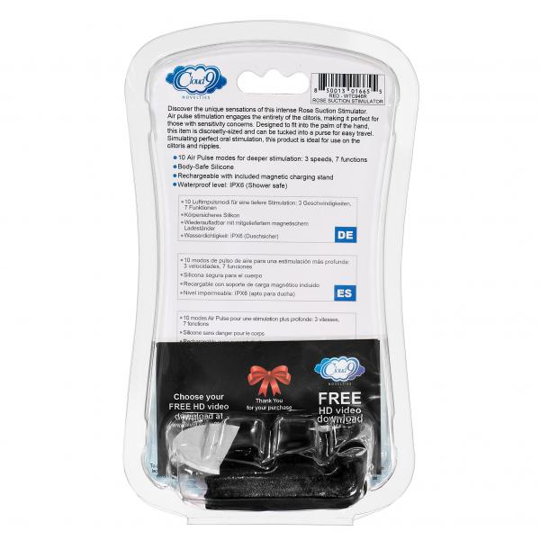 Cloud 9 Health and Wellness Rose Suction Stimulator Red. Discover the unique sensations of this intense Rose Suction Stimulator. Air pulse stimulation engages the entirety of the clitoris, making it perfect for those with sensitivity concerns. Designed to fit into the palm of the hand, this item is discreetly sized and can be tucked into a purse for easy travel. Simulating perfect oral stimulation, this product is ideal for use on the clitoris and nipples. Features: 10 Air Pulse modes for deeper stimulation: 3 speeds, 7 functions. Made using body safe Silicone. Phthalate free, latex free. Rechargeable with magnetic charging stand, included. Waterproof level: IPX6 shower safe. Splashproof. MAPs price 59.95.