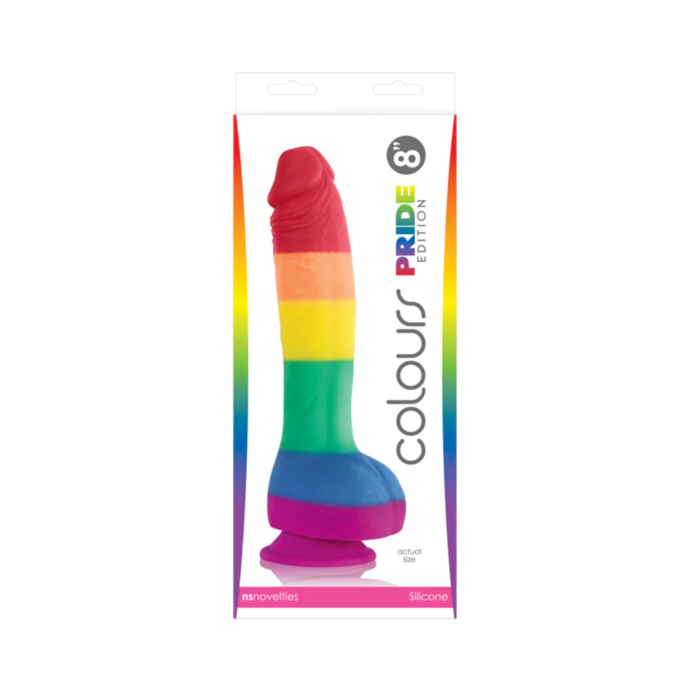 This realistic silicone dong features pride colors, balls, and a suction cup for hands-free fun. Measures 10 inches long, 8 inches insertable, 2.6 inches wide.