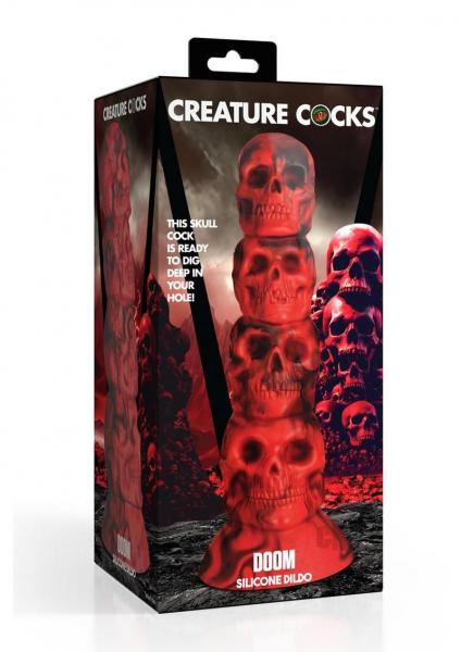 This hellspawned Creature Cock dildo is truly inspired by horrors and dark magic! The tower of skulls is 4 red skulls with different shaped eye sockets and jaws stacked upon each other. Enjoy the round head that penetrates and the dozens of grooves and ridges from the unique texture! Made out of premium, silky smooth, phthalate-free silicone it has a squishy outside and firm, flexible core that is body-safe. Only use water-based lubricants for best results. The strong, suction-cup base lets you ride hands-free when it's placed on any flat surface. It's harness-compatible so you can enjoy it with a partner or attach the harness to a chair or bench. Enjoy your kinky cosplay, fantasy roleplay, and self-pleasure with this fantasy dildo! After play, wash with warm water and mild soap then spray with a toy cleaner and let it air dry.You stand at the center of the sorcerer's circle, surrounded by other coven members. Fire lights the circle and symbols are drawn on the ground. You've followed every step to get the power you desire, and finally the leader calls out the last command. "Ride the tower of skulls and gain its power!" You look at her, confused. What does she mean? "You must take the tower within you and absorb its power!" You see the small tower of skulls and cringe. Not that! You thought it was just decoration! Symbolism for the ritual! Someone coughs loudly, and the leader urges you on. "Now! Before the storm passes, you must be the lightning rod for this power!" You take off your underwear. You're only wearing a loose robe now. You position yourself over the skulls and touch them to guide them in. This is the first time you realize they are wet with… is that blood? You feel a flash of terror but steel your nerves. You squat down and… it feels… amazing! You feel the surge of magic and power humming through the shaft. You slide deeper and your eyes roll to the back of your head in ecstasy! Everyone is watching, and as you cry out, lightning flashes and you feel it through your body! Power! Pleasure! And so much more!Measurements: Overall length: 9.4 inches. Insertable length: 8 inches. Narrowest insertable diameter: 1.7 inches. Widest insertable diameter: 2.8 inches.Materials: SiliconeColor: Red, black Key Features: Fantasy Dildo: A tower of red and black skulls, ready to penetrate you! Strong Suction Cup: Enjoy hands-free rides with this strong, suction cup base that can be placed on any flat surface. Harness Compatible: Use it with a compatible harness for strapon or pegging play! Premium Silicone: Made out of premium, silky smooth, phthalate-free silicone it is soft and squishy on the outside while remaining firm on the inside. Use only with water-based lubricants.