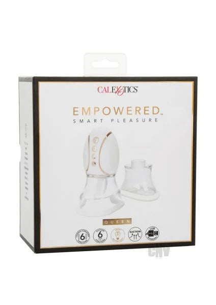 Empowered Smart Pleasure Queen from California Exotic Novelties. Lets set the mood. First, thrilling suction to increase the blood flow and sensitivity. Then, once you find the sucking sensation you carve, it is time to play with the 6 different suction patterns. And last, but certainly not least, on to the sensual tongue as it moves and vibrates in 6 unforgettable ways. Now, this is a pleasure experience made just for you! The Empowered Smart Pleasure Queen provides 36 mind blowing combinations of suction, vibration and flickering action. This Queen is smart, allowing you to program your favorite setting. Set the suction pressure you love, and then explore the suction, vibration and licking sensations: all with the pressure you desire. For use on all body types, the Smart Pleasure Queen comes with 2 interchangeable cups full coverage and demi cup. This gives you even more variety when using this Queen. A discreet storage bag is included for when you want to bring pleasure with you, but want to keep things private. Easily recharged with the included USB cord with complete charge in under 2 hours. Specifications: Color White. Materials Silicone, ABS Plastic with Polyurethane Cote, ABS Plastic with Metallic Plating. Power source USB Rechargeable, included. Features Phthalate Free, Rechargeable, Vibrates. 1 year warranty. Maximum run time 70 minutes. Maximum charging time 90 minutes. Measurements 3.25 inches by 2.5 inches controller. 3.25 inches by 2.25 inches Demi cup. 3.75 inches by 2.5 inches Full coverage cup. 1.5 inches by 0.75 inch tongue. Bulk weight 10 ounces. Package 22.8 ounces . Package 4 inches by 6.75 inches by 8 inches.