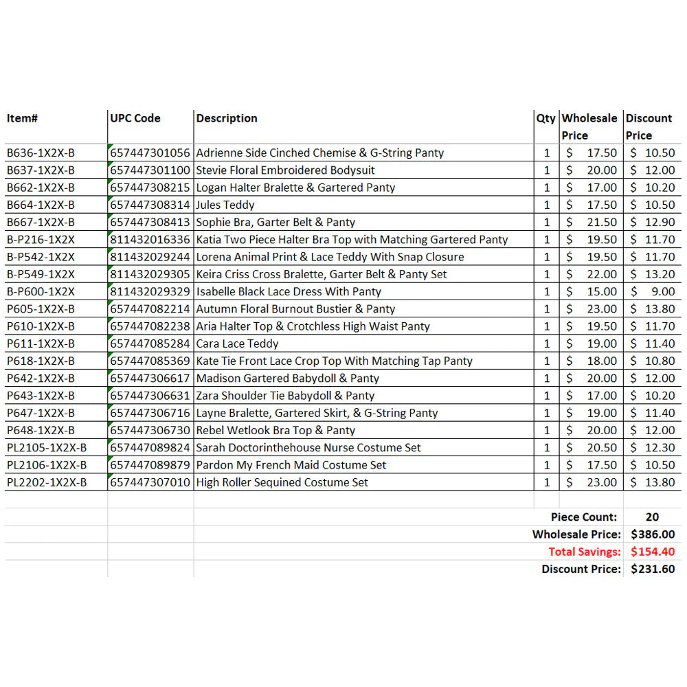 Item#: B636-1X2X-B | UPC#: 657447301056 | Adrienne Side Cinched Chemise & G-String Panty | Price: $ 10.5Item#: B637-1X2X-B | UPC#: 657447301100 | Stevie Floral Embroidered Bodysuit | Price: $ 12Item#: B662-1X2X-B | UPC#: 657447308215 | Logan Halter Bralette & Gartered Panty | Price: $ 10.2Item#: B664-1X2X-B | UPC#: 657447308314 | Jules Teddy | Price: $ 10.5Item#: B667-1X2X-B | UPC#: 657447308413 | Sophie Bra, Garter Belt & Panty | Price: $ 12.9Item#: B-P216-1X2X | UPC#: 811432016336 | Katia Two Piece Halter Bra Top with Matching Gartered Panty | Price: $ 11.7Item#: B-P542-1X2X | UPC#: 811432029244 | Lorena Animal Print & Lace Teddy With Snap Closure | Price: $ 11.7Item#: B-P549-1X2X | UPC#: 811432029305 | Keira Criss Cross Bralette, Garter Belt & Panty Set | Price: $ 13.2Item#: B-P600-1X2X | UPC#: 811432029329 | Isabelle Black Lace Dress With Panty | Price: $ 9Item#: P605-1X2X-B | UPC#: 657447082214 | Autumn Floral Burnout Bustier & Panty | Price: $ 13.8Item#: P610-1X2X-B | UPC#: 657447082238 | Aria Halter Top & Crotchless High Waist Panty | Price: $ 11.7Item#: P611-1X2X-B | UPC#: 657447085284 | Cara Lace Teddy | Price: $ 11.4Item#: P618-1X2X-B | UPC#: 657447085369 | Kate Tie Front Lace Crop Top With Matching Tap Panty | Price: $ 10.8Item#: P642-1X2X-B | UPC#: 657447306617 | Madison Gartered Babydoll & Panty | Price: $ 12Item#: P643-1X2X-B | UPC#: 657447306631 | Zara Shoulder Tie Babydoll & Panty | Price: $ 10.2Item#: P647-1X2X-B | UPC#: 657447306716 | Layne Bralette, Gartered Skirt, & G-String Panty | Price: $ 11.4Item#: P648-1X2X-B | UPC#: 657447306730 | Rebel Wetlook Bra Top & Panty | Price: $ 12Item#: PL2105-1X2X-B | UPC#: 657447089824 | Sarah Doctorinthehouse Nurse Costume Set | Price: $ 12.3Item#: PL2106-1X2X-B | UPC#: 657447089879 | Pardon My French Maid Costume Set | Price: $ 10.5Item#: PL2202-1X2X-B | UPC#: 657447307010 | High Roller Sequined Costume Set | Price: $ 13.8