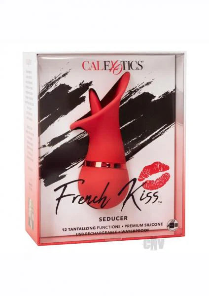 The sensual French Kiss Seducer is ready to slip into your purse or overnight bag for orgasmic pleasure on-the-go. The compact massager is sure to deliver powerful flickering pleasure with 12 sensual functions of fluttering vibrations through the tongue-like tip. The full contact scoop and fluttering tongue teaser has been crafted to perfectly contour to your most intimate pleasure points. The soft supple silicone and sensually contoured body let you deliver pinpoint pure pleasure form almost angle. Use the easy-touch button to control up to 70 minutes of vibrating pleasure. Recharge up your pleasure in only 1.5 hour with the provided USB cable into the self-healing charging port on the massager. The mini massager?s discreet size and travel-lock button makes it the perfect travel companion, letting you embrace radiating pleasure wherever your fantasies take you. Materials: Silicone, ABS Plastic / Metallic Plating. Power Source: USB Rechargeable (Included) Features: Phthalate Free, Waterproof, Rechargeable, Vibrates Max Run Time 70 minutes Max Charging Time 90 minutes Measurements 2.75" x 2.25" / 7cm x 5.75cm (Arouser) 5" x 2.25" / 12.75cm x 5.75cm (Overall) One Year Warranty.