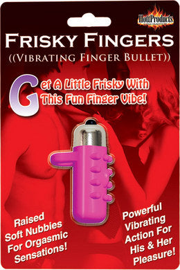 Frisky Fingers (Purple)Feeling a little frisky? You will be with the Frisky Fingers finger vibes! Slips on to any finger to sooth and caress your most intimate regions. Super soft sensuous silicone with raised nubbies to vibrate you into an erotic frenzy! Waterproof, with inter-changeable batteries.Batteries Included.