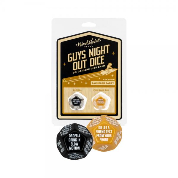 Two Large 28mm 12-sided Dice Premium Packaging For Adults Only! 'Roll' play with this Guys Night Out 'Do Or Dare' Dice bachelor party game! Features two large 28mm 12-sided dice that tell you and your crew what to do, if you dare. Last guy standing wins!Dice 1: Do This... Drop And Do Ten Push-Ups High Five The Bartender Loudly Bark Like A Dog Flirt With A Random Woman Order A Drink In A Pirate Accent Arm Wrestle A Stranger Show Off Your Karate Moves Give Piggyback Ride To A Stranger Friends Scroll Your Photos (10 Secs) Leave Your Fly Down All Night Dance The Robot Order A Drink In Slow Motion Dice 2: While Doing This Or Do A Shot Or Shotgun Your Drink Or Sing A Song For Everyone Or Buy A Shot For A Stranger Or Buy A Round For Your Friends Or Let A Friend Text From Your Phone Or Rap Your Next Drink Order Or Tell A Filthy F’n Joke Or Drink From Your Shoe Or Hold Hands With A Stranger Or Sit On A Friend’s Lap For 1 Drink Or Order The Girliest Cocktail