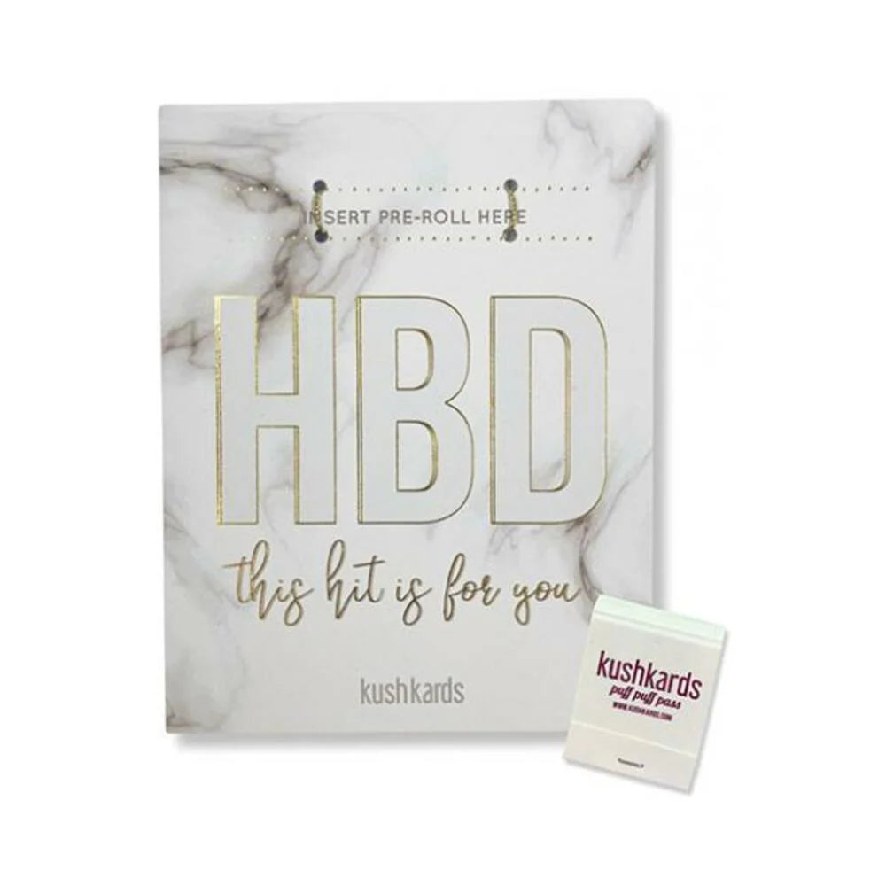 The perfect way to say Happy BirthDay. Our "HBD Birthday" Cannabis Greeting Card is our classiest card featuring a white marble look and gold writing. Gift this Stoner Birthday Card to your "high" class buds. Front Message: HBD this hit is for you Inside Message: (Blank Inside) Size: 4.25" x 5.5" Includes a slot for inserting matchbook(included)