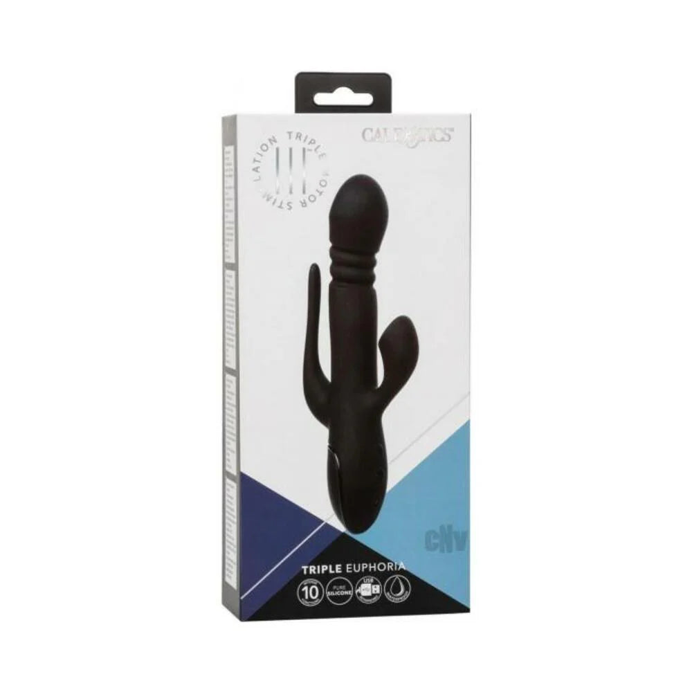 Powerful triple action massager with motors located in the shaft, stimulator and tail. 3 speeds of thrusting action in the shaft. 10 functions of intimate suction in the stimulator. 10 functions of vibration, pulsation and escalation in the tail. Body-safe Silicone and 100% waterproof. Independently operated shaft and stimulators. USB rechargeable charging cord included.