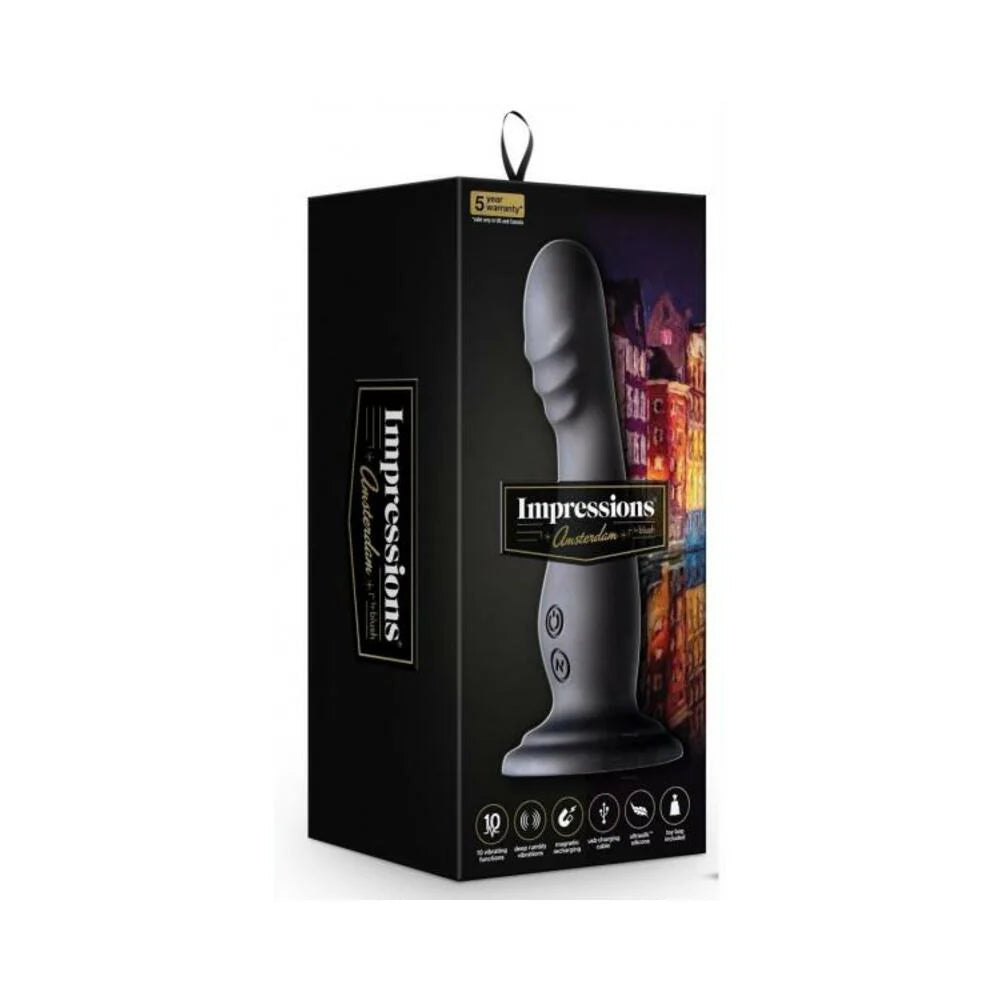 The Impressions Amsterdam is ready to deliver fun all year long! The sleek curves of Amsterdam match your anatomical pleasure points and the ribbed head provides additional, powerful sensations to your play. With powerful vibrations that cycle through 5 levels and 5 variations of pulsation and escalation using the RumbleTech motor, Amsterdam is ready to take you on the ultimate adventure. The flared base makes it harness compatible and safe for anal play. The powerful suction cup allows you to play hands free; just stick it to any smooth, flat surface. Amsterdam is USB magnetic rechargeable (to ensure it remains waterproof for the lifetime of the product) and IPX7 waterproof for easy cleaning. Ultrasilk smooth and made with Puria Platinum-Cured Silicone, it`s body-safe, and phthalate free. With Impressions, the possibilities are endless, so pack up and get ready to go to Amsterdam!
