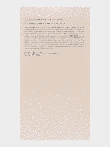JO Limited Edition Champagne 2 fluid ounces and Red Velvet Cake 2 fluid ounces Set. JO 20 Year Anniversary Celebration Kit is the perfect way to get your party started. This celebratory gift set includes one 2 ounces bottle each of our all new Red Velvet Cake and Champagne flavored lubricants. Like all JO water based flavors, these new formulas feel as good as they taste! Personal Lubricant for penile, anal and/or vaginal application indicate intended to moisturize. To enhance the ease of comfort of sexual and supplement the body's natural lubrication. This product is compatible with Latex condoms. Polyurethane condoms. Directions: apply desired amount to genital areas. Reapply as needed or as needed or desired. Key features: Water based personal lubricant. Mix and match flavors, Sex toy friendly. Compatible with most latex condoms. Ingredients JO Champagne, Red Velvet Cake Personal Lubricant: Water, Glycerin, Potassium Sorbate, Hydroxyethylcellulose, Flavor, Aroma, Sucralose, Sodium Chloride, Citric Acid. If these items are used with latex condoms do not reuse. Always start with a new latex condom. Warning: If irritation or discomfort occurs discontinue use and contact a physician. Very slippery on surfaces Clean spills immediately. Keep out of reach of children. This product is not a contraceptive, spermicide. Categories: Health and Beauty Aids, X-Mas items, Personal Lubricants, Water Based Lubricant, Flavored Lubes, Oral Products. 2022.
