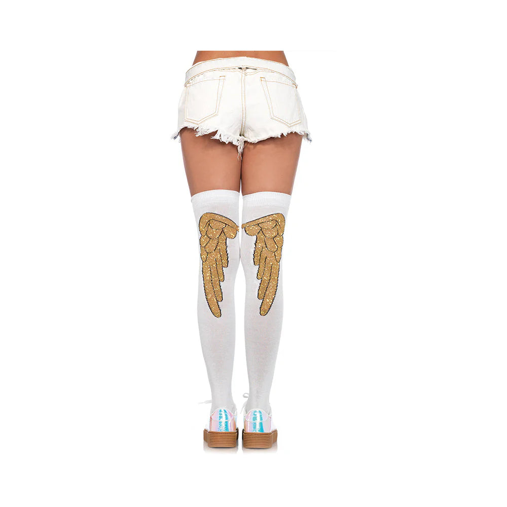 Shimmering over the knee socks feature a unique pair of angel wings, sure to attract attention. One size fits most.