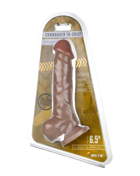 Major Dick Commander In Chief Caramel Tan Straight Dildo features harness compatible. PVC. Suction cup base for solo use. Just stick it onto any flat surface. Authentic phallic detail. 6.5 inches by 1.45 inches.