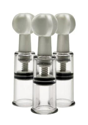 Enjoy powerful suction with this triple set of demurely sized suction cylinders. Just apply to any area that would benefit from increased sensitivity and blood flow, no pumps or accessories needed. These self-contained suction devices work with a simple twist. Silent, simple, and discreet, these suckers can be taken and used practically anyway for on the go stimulation. Lubed internally for smooth movement and a strong seal that makes for sublimely powerful suction. Measurements: Opening is 0.75 inches in diameter, tube is 2.35 long and entire item is 4 inches long. Material: ABS plastic. Color: Clear