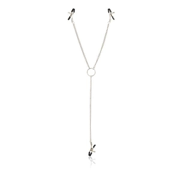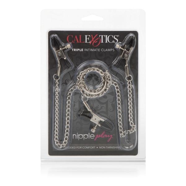 Nipple Play Triple Intimate Clamps includes 3 fully adjustable multi-use clamps. Soft, comfortable pads. Sturdy high quality dual chain for added sensuality. Non-tarnishing, nickel free. Safe and pure for body and pleasure made using phthalate free materials. Nickel free Iron chains, clamps, PVC pads. 2.25 inches by 1 inch each clamp. 26.5 inches overall length. Bulk weight 2.5 ounces.