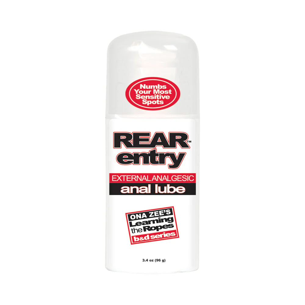 Ona Zee's Rear Entry Anal Lube 3.4 ounces Desensitizing Lubricant. Anal penetration should be exciting and sensual, not uncomfortable. That is why Doc Johnson offers Ona Zee's Rear Entry external anal analgesic, to desensitize tender rectal tissues and prepare them for what lies ahead. Ona Zee's Rear Entry Anal Lube is available in two sizes: 1.7 ounces and 3.4 ounces. Each sold separately. Formulated to slightly numb the external area around your rectum so you can focus on the pleasure without any interruptions. Desensitizing anal lubricant. Ona Zee's Learning the Ropes B&D series. Rear Entry Anal Lube from Doc Johnson Novelties Great American Toy Company Made in the USA.