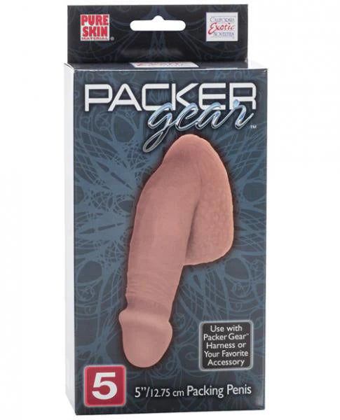 Uniquely designed base for secure fit in Packer Gear harness or your favorite accessory. Soft and comfortable, the perfect packing penis. Ultra life like Pure Skin material. Maintenance free. Material: Thermoplastic Rubber TPR. 5.75 inches by 3.25 inches overall, 5 inches by 1.5 inches penis.