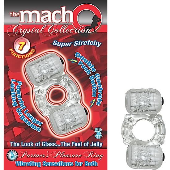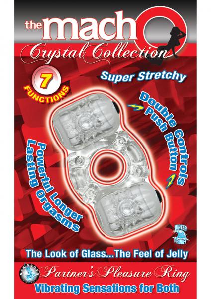 The Macho Crystal Partner's Pleasure Ring Clear super stretchy vibrating sensation for both. The look of glass. The feel of jelly. Double vibrating bullets with stimulating nubs. 7 functions. Easy to operate. Push button power control. Waterproof vibrations for play outside the bedroom. Vibrating cock ring requires 4 AG10 batteries, included. Made using phthalate free, non-toxic material: SEBS. Cock ring measures 3.875 inches long. Always clean before and after use. The Macho Crystal Partner's Pleasure Ring Clear from Nasstoys of New York.