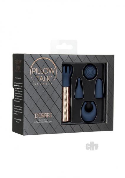 Description: Expand your world of pleasure with the Pillow Talk® Secrets 6-Piece set, Desires! This luxurious kit is a great starting point for anyone looking to explore the sensual and intense world of bullet vibrators. Powered by the incredible PowerBullet® motor, Desires will give you deep rumbles at speeds that range from mild to wild.andnbsp; The incremental speed is easily controlled by pressing and holding the button on the base.andnbsp; You are in control of your pleasure level!andnbsp; Desires features 5 interchangeable silicone heads, each with their own unique shape and sensation.andnbsp; The classic Lipstick head provides a smooth angled tip for sensational surface coverage.andnbsp; The Pinpoint tip features a narrow ball for precision vibe delivery and the Dual Pinpoint tip has two ball tips for double the precision and is prefect for nipple play.andnbsp; The Grooved Orb has round ridges that deliver those vibrations on waves of lip-biting bliss.andnbsp; Finally, the Tickler head has 8 soft fingers arranged in an encompassing circle to tease and tickle nipples or other sensitive spots.andnbsp; Each head easily pops off the bullet base with a pull and pops back on with a push.andnbsp; They`re made from 100% body safe silicone and are easy to clean.andnbsp; Play on your own or let your partner explore your body with the different tips, discovering new and exciting hot spots all over your body.andnbsp; The powerful vibrations are concentrated towards the tip of the bullet, so when you hold it at the base, you can direct those knee-shaking vibration right where you want them.andnbsp; Desires comes with a satin storage pouch so you can keep all the heads together with the bullet and tuck them away until your next sexy adventure.andnbsp; There is also an included cleaning brush, to keep the grooves on the bullet clean, and make sure to clean the heads and bullet with a toy cleaner before and after each use.andnbsp; A convenient travel lock means you can take Desires on the go with you and the included USB cable will help you keep it charged for whenever you need it. Incredibly powerful vibrations with a variety of elegant experiences.andnbsp; Say hello to your new Desires! andnbsp; Key Features: Bullet Vibrator Incremental Speed Control 5 Interchangeable Silicone Heads Powered by PowerBullet® Discreet Size Travel Lock Press and Hold Technology Easy to Clean Easy to Use Waterproof (IPX6) Magnetic USB Rechargeable Charge Time: 1.5 Hours Up to 2.5 Hours of Playtime andnbsp; Dimensions: Bullet Length: 3 in. Bullet Diameter: 0.7 in. andnbsp; Included in the Box: Bullet Vibrator Lipstick Head Tickler Head Pinpoint Head Dual Pinpoint Head Grooved Orb Head Magnetic USB Charge Cable Cleaning Brush Satin Storage Pouch Quick Start Guide
