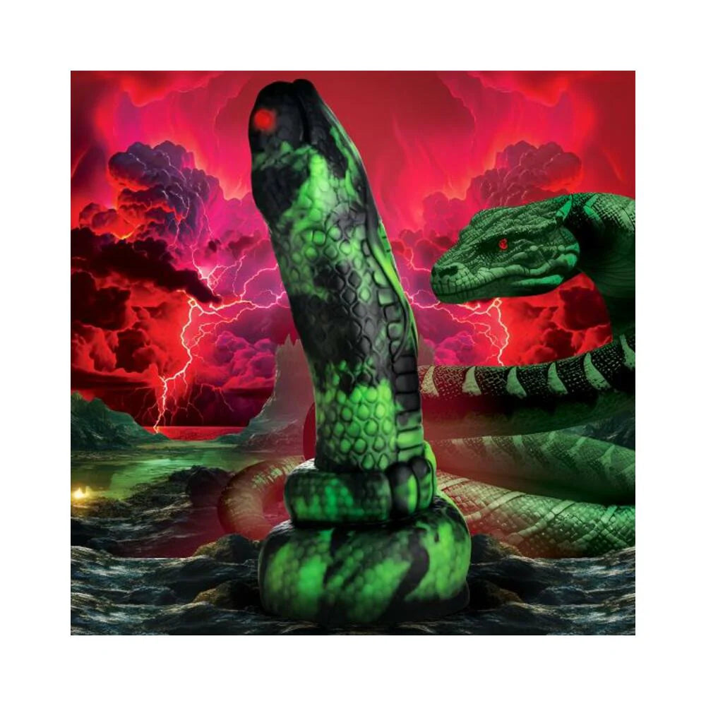 This silicone python is meaty and ready to slither inside you! It has a large head with a tapered nose, red glowing eyes, and black and green scaled skin. The thick shaft will stretch you out as the big head rubs all the right spots! Made out of premium, flexible, phthalate-free silicone, this dong is body-safe and best used with water-based lubricants only. Enjoy hands-free rides due to the strong suction cup base! Invite a partner to indulge in kinky cosplay or fantasy roleplay and use their favorite harness to transform this dong into a strap-on! Afterward, make sure to wash it with warm water and mild soap, then spray it with a toy cleaner and air-dry. Keep out of direct sunlight and heat. You've danced many nights, performing with this python wrapped around your shoulders and neck, slithering over all your curves and climbing your muscles. You've performed for kings and queens, on stage for hundreds or a select few. Tonight, you take your trusty python out to practice. It slithers over your shoulders as usual, and you gaze at yourself in the mirror. Your body glistens in the dim candlelight, the flames flickering and lighting up shadows and firelight across your skin. The snake slowly moves, urging you to move with it. You undulate your spine, roll your belly, and dance the serpent dance. Each step and move puts you into a trance-like state as you dance. The music in the background sets your heart on fire. You feel the heat spreading through your body, from your belly to your chest to your fingertips. It burns deep in your loins, between your thighs, reaches the pads of your feet. You dance until you sweat, and the snake moves around you, dancing with you. It slithers around your thigh, moving differently than usual, and you bend down, kneeling, to give it access to the floor. Maybe it wants off? But no, it goes towards your inner thigh, then starts to wriggle its head between your thighs. You gasp in shock! You are so open, on fire, and turned on by the dancing. Its head pushes inside you, the sweat creating a slick entrance and you start to gasp and moan, in shock and unable to stop the strong python sliding deeper inside! It moves inside, the muscles squeezing, until you shudder in ecstasy and push it out! YOu collapse on the floor, your body reeling in pleasurable waves, until the snake coils itself on your chest, its tongue tasting the air near your throat. Measurements : Overall length: 9.6 inches. Insertable length: 7.25 inches. Narrowest insertable diameter: 2.1 inches. Widest insertable diameter: 2.5 inches. Materials : Silicone Color : Green, black, red
