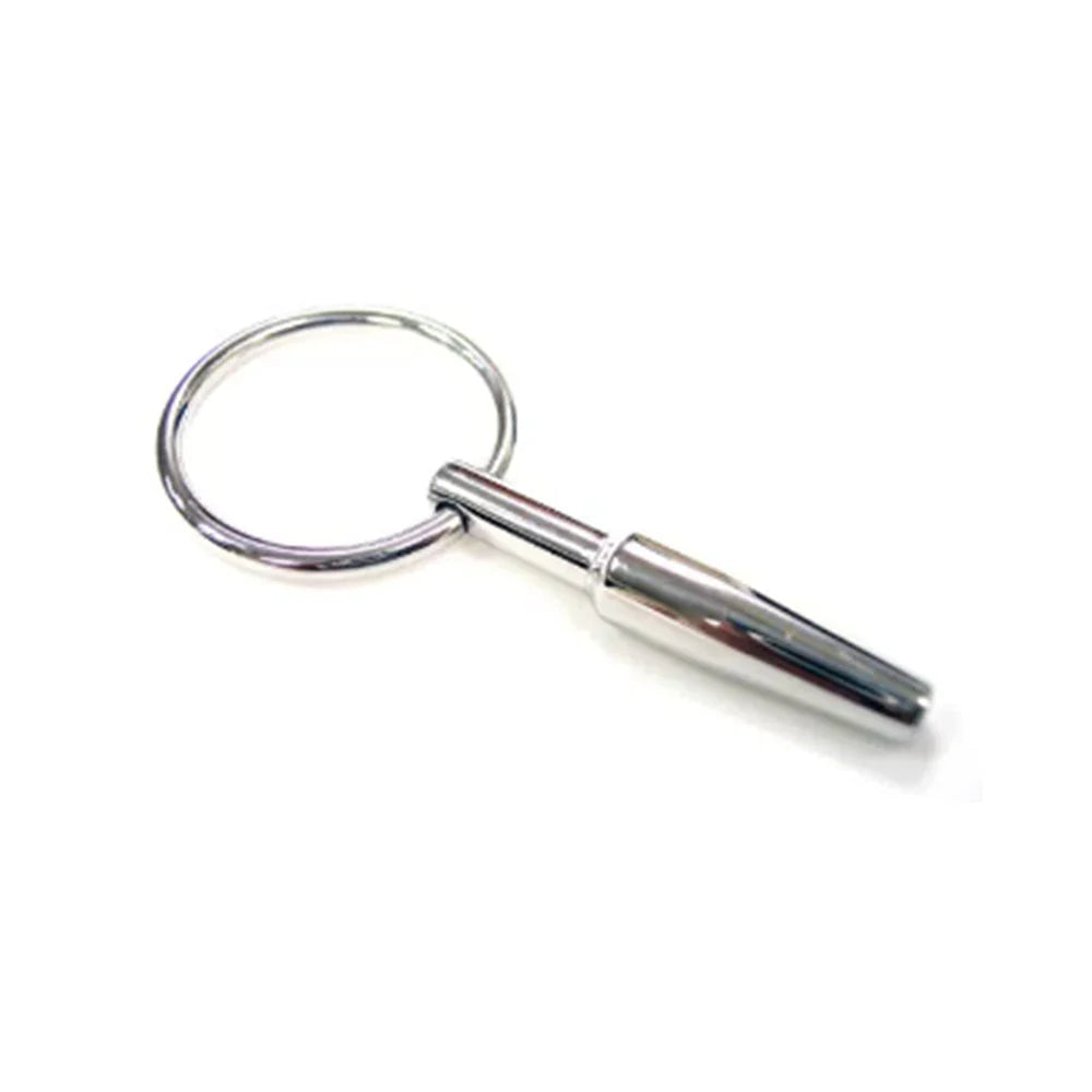 Stainless steel urethral plug is gently tapered for easy insertion. Ring pull at the top for easy removal. Designed for deep probing, its ring will lock perfectly under the head of the penis, allowing it to stay on for as long as needed. Features an opening for easy ejaculation and urination. Measures 9mm at the widest point, 38mm long.