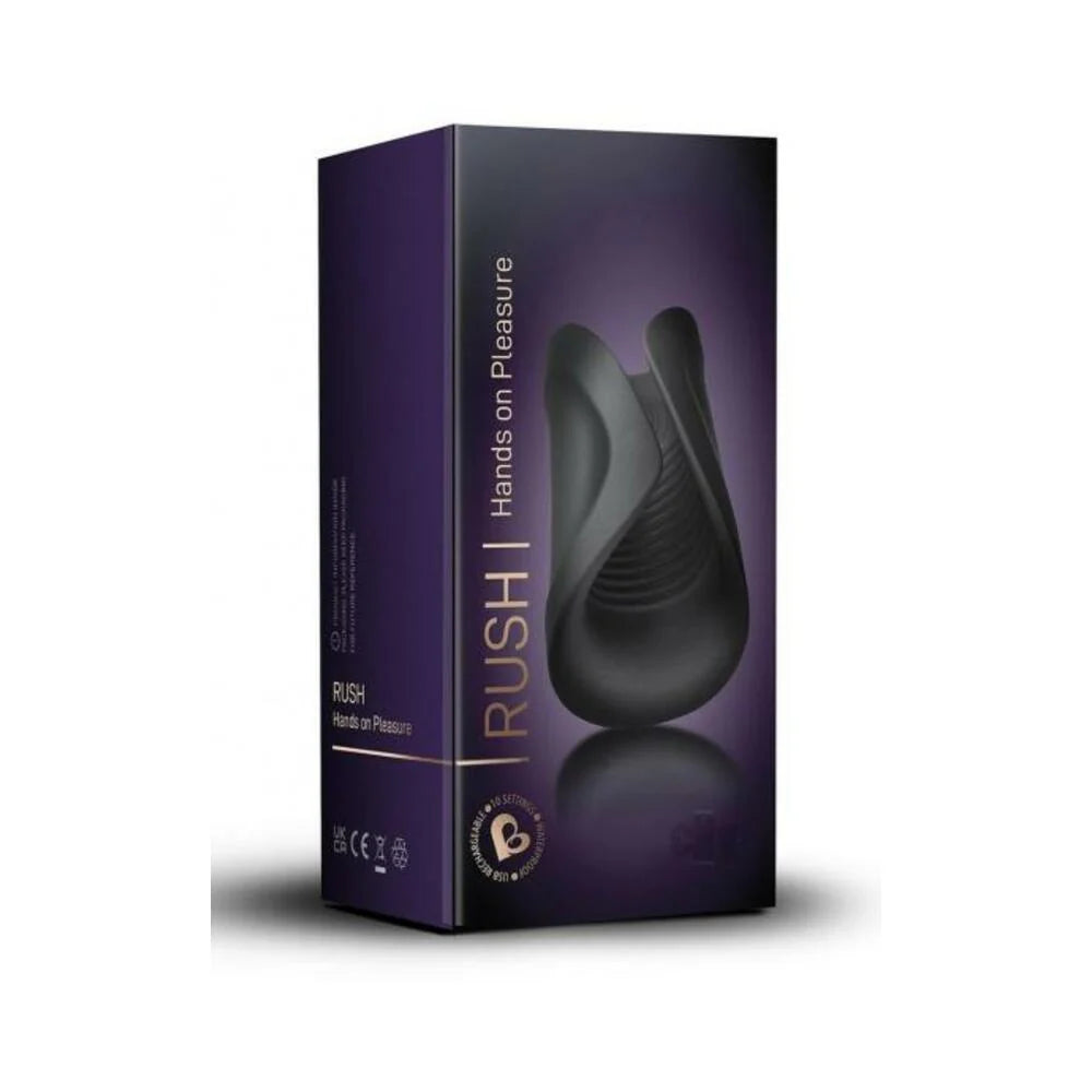 Indulge yourself in a rush of orgasmic pleasure with this powerful palm sized stroker. Strong vibration andamp; masculine pulsations meet tactile sensory textured silicone giving you the power andamp; personal fit to decide your own style of stimulation. Whether you let Rush take the lead to entice you into effortless orgasm or you decide to lube up, take a firm hold andamp; stroke yourself to ultimate satisfaction, it`s really all about you!