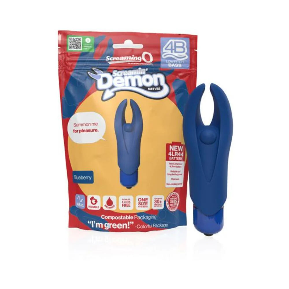 The deep-rumbling 4B Demon mini vibe is a clever and compact mini vibe with flexible "horns" that transfer powerful vibrations all the way to their tips for targeted and devilishly intense sensations. Its 5-speed motor features a bonus pulsation mode and makes it easy to unleash your inner nymph while exploring and discovering your favorite kind of intimate mischief. And for fans of direct clitoral stimulation, the 4B Demon boasts a firm pleasure bead right between its horns to transfer extremely strong vibration right where you want it. The 4B Demon is the perfect clitoral vibe for those who like lots of power packed into a compact shape. Use on the nipples and other sensitive zones for flirty foreplay or use it to help orgasms come faster and easier solo or with a partner. It's a portable and affordable sex toy for users of all experience levels and can even be used under water to turn an ordinary shower or bath into a wickedly satisfying experience!Screaming O 4B Demon is manufactured using materials and processes that are both ethical and sustainable. Because in addition to promoting sexual health and wellbeing, Screaming O strongly believes in leaving this planet better off than we found it. For example, the 4B Demon packaging is compostable, eco-friendly packaging made from a combination of recyclable Kraft paper and biodegradable & compostable PLA.Additionally, new 4LR44 batteries are being implemented for the bullets. Not only are these batteries more reliable and longer lasting for your pleasure, they are also child-safe and require fewer units to power the products therefore adding less waste to the landfills.Features: 4B motor providing deep, rumbling vibrations Flexible "Horns" Provide Delightful Pleasure Made of 100% body-safe True Silicone® and ABS materials 5 speeds plus 1 pulse pattern 30+ minutes of battery life New reliable and long-lasting 4LR44 battery Waterproof