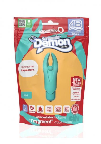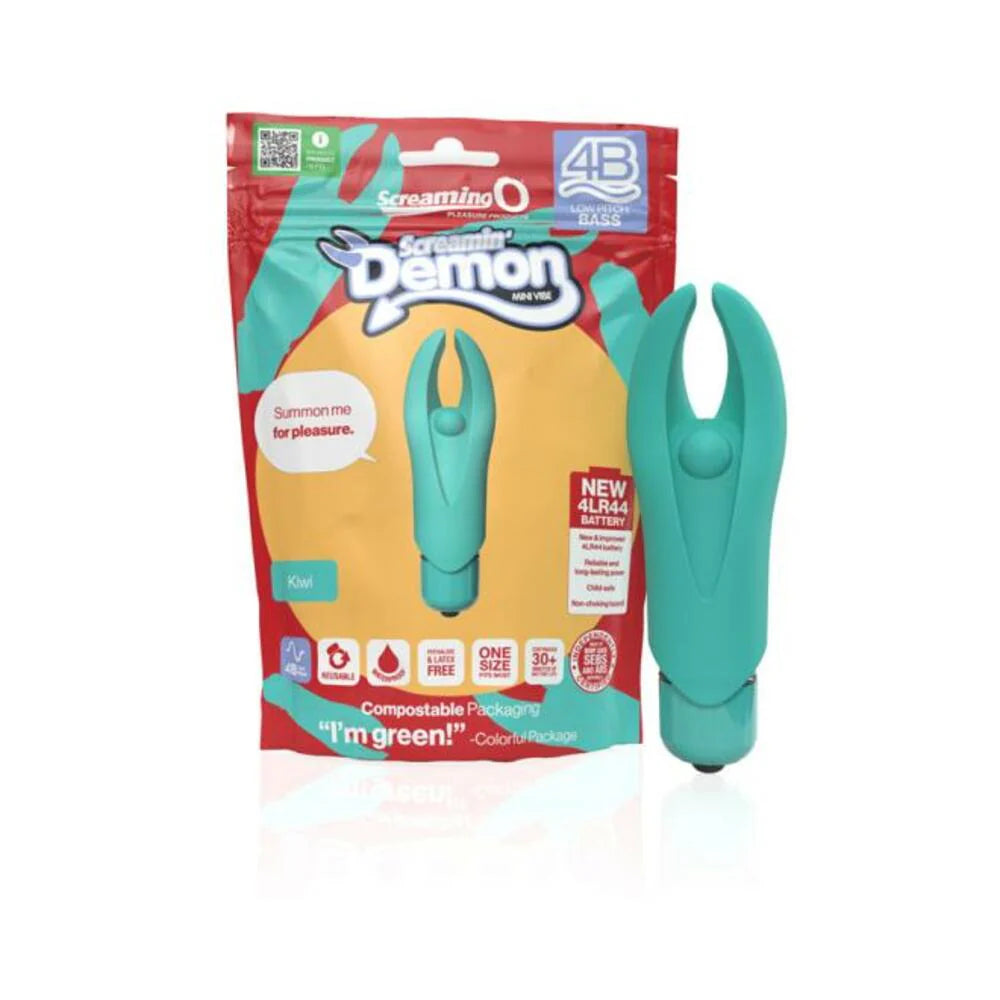 The deep-rumbling 4B Demon mini vibe is a clever and compact mini vibe with flexible "horns" that transfer powerful vibrations all the way to their tips for targeted and devilishly intense sensations. Its 5-speed motor features a bonus pulsation mode and makes it easy to unleash your inner nymph while exploring and discovering your favorite kind of intimate mischief. And for fans of direct clitoral stimulation, the 4B Demon boasts a firm pleasure bead right between its horns to transfer extremely strong vibration right where you want it. The 4B Demon is the perfect clitoral vibe for those who like lots of power packed into a compact shape. Use on the nipples and other sensitive zones for flirty foreplay or use it to help orgasms come faster and easier solo or with a partner. It's a portable and affordable sex toy for users of all experience levels and can even be used under water to turn an ordinary shower or bath into a wickedly satisfying experience!Screaming O 4B Demon is manufactured using materials and processes that are both ethical and sustainable. Because in addition to promoting sexual health and wellbeing, Screaming O strongly believes in leaving this planet better off than we found it. For example, the 4B Demon packaging is compostable, eco-friendly packaging made from a combination of recyclable Kraft paper and biodegradable & compostable PLA.Additionally, new 4LR44 batteries are being implemented for the bullets. Not only are these batteries more reliable and longer lasting for your pleasure, they are also child-safe and require fewer units to power the products therefore adding less waste to the landfills.Features: 4B motor providing deep, rumbling vibrations Flexible "Horns" Provide Delightful Pleasure Made of 100% body-safe True Silicone® and ABS materials 5 speeds plus 1 pulse pattern 30+ minutes of battery life New reliable and long-lasting 4LR44 battery Waterproof
