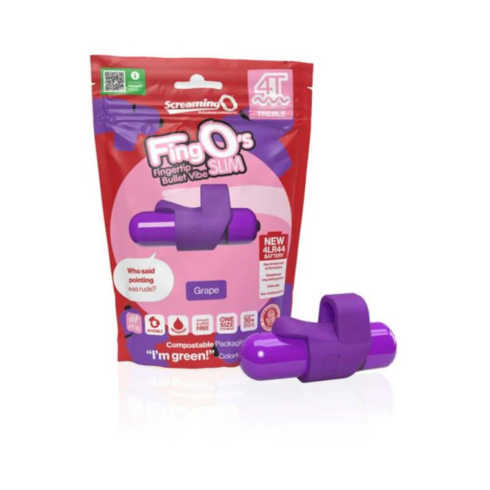 Put pleasure at your fingertips with the 4T FingO Slim, a sleek finger vibe powered by the new 4T Bullet! Featuring a unique 6-function tickle and tease motor, the 4T FingO Slim offers intense, high-pitch vibrations and turns your finger into your new favorite sex toy – and it's 100% waterproof, too! The 4T FingO Slim is a compact and portable mini vibe that makes it easy to incorporate powerful massage to almost any sex position without interruption or skipping a beat. Simply stretch the convenient loop around your finger to keep it securely in place during any intimate act that could use a vibration boost, even in the bath or shower!Screaming O 4T FingO Slim is manufactured using materials and processes that are both ethical and sustainable. Because in addition to promoting sexual health and wellbeing, Screaming O strongly believes in leaving this planet better off than we found it. For example, the 4T packaging is compostable, eco-friendly packaging made from a combination of recyclable Kraft paper and biodegradable & compostable PLA.Additionally, new 4LR44 batteries are being implemented for the bullets. Not only are these batteries more reliable and longer lasting for your pleasure, but they are also child-safe and require fewer units to power the products therefore adding less waste to the landfills.Features: 4T motor with tickle and tease, treble vibrations Adds stimulating vibration to almost any sex position Made of 100% body-safe True Silicone® and ABS materials 5 speeds plus 1 pulse pattern 30+ minutes of battery life New reliable and long-lasting 4LR44 battery Waterproof