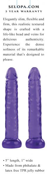 SIMPLICITYElegantly slim, flexible and firm, this realistic textured shape is crafted with a life-like head and veins for delicious authenticity. Experience the dense softness of its remarkable material that's designed to please. SEX LOVE PASSION Life-like jelly dildo VIBRATION Non-vibrating MATERIAL Phthalate & latex free TPR rubber WATERPROOF & SUBMERSIBLE Yes WARRANTY Five Years WEIGHT 2.6 oz. (with packaging: 4.2 oz.) DIMENSIONS H: 6.19", W: 1.53", D: 1.53" INSERTABLE LENGTH 5.5"