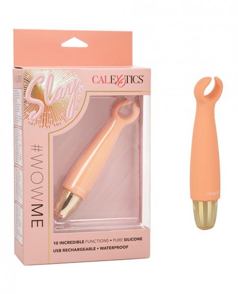 Slip the tickling Slay #WowMe into your luggage for knee-shaking pleasure wherever you go. The tickling teaser fits between your fingers to let you deliver pinpoint tantalization and thrill with flickering vibrations. Get playful while you flicker through 10 indulgent vibration, pulsation and escalation functions with the easy-touch control button. The unique flexible open design is great for exploring sensual sweet spots and delivering pinpoint stimulation with ease. Effortlessly control pure pleasure with an easy-touch silicone button and hold for 3 seconds to turn on or off. Use the smooth single button control to enjoy up to 70 minutes of vibrating pleasure. Charge up your passion in only 1.5 hours by plugging the provided USB cable into the self-sealing charging port on the back of the massager. Materials: Silicone ABS Plastic / Metallic Plating Waterproof Travel Lock USB rechargeable - cord included Charge Time- 90 minutes Max Run Time - 70 minutes Dimensions: Overall Length - 5.25 inches Insertable Length - 4 inches Width - 1 inch One Year Warranty