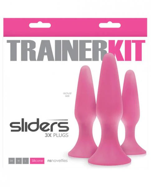 Sliders 3 Piece Trainer Kit Pink. The Sliders Trainer Kit includes three assorted sizes of firm, flexible and tapered plugs designed for effortless penetration. Velvety soft to the touch, these satin finish toys are easy to clean and safe to use with any lubricants. Each features a strong suction cup base for creative sexual fun. Bulk weight 12.1 ounces.Small: 4.47" long. 3.00" insertable. 1.10" wide.Medium: 4.90" long. 3.40" insertable. 1.25" wide.Large: 6.00" long. 4.10" insertable. 1.51" wide.