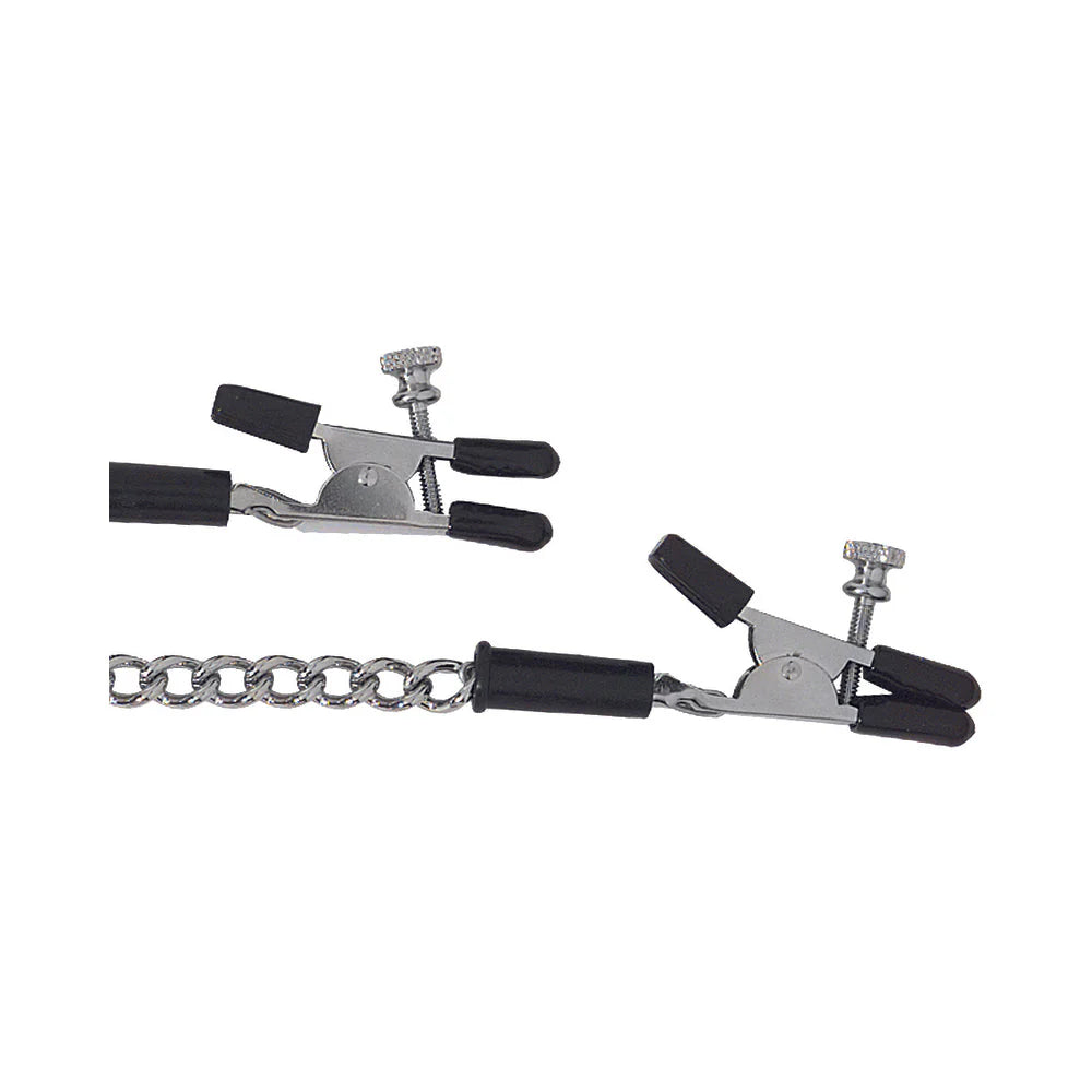 Spartacus Adjustable Nipple Clams With Curbed Chain Rubber TippedApply the perfect amount of pressure with these adjustable nipple clamps. The stimulating effect will make your nipples the center of attention, as they should be.