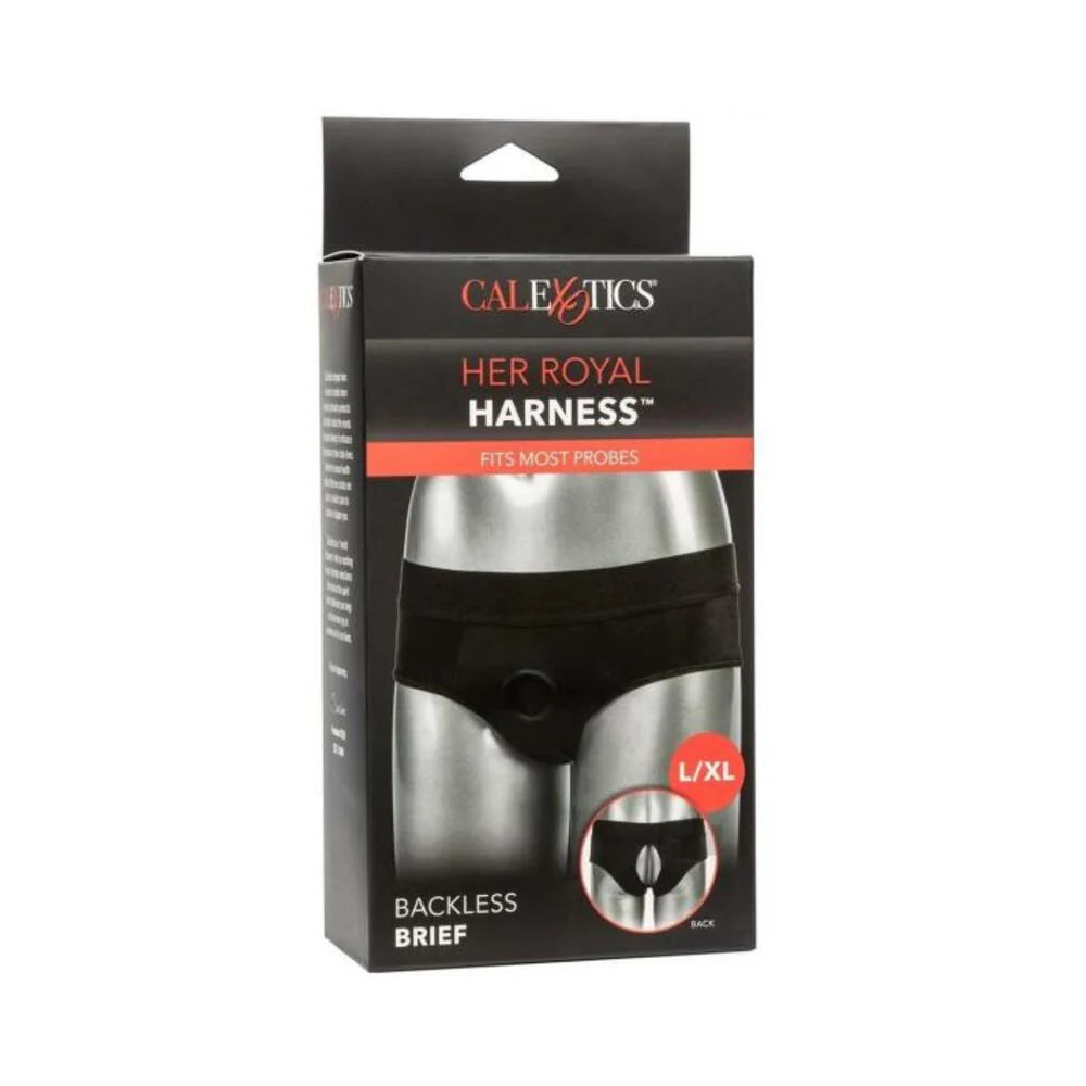 The Her Royal Harnessandtrade; Backless Brief is an ultra-comfortable harness fashioned like a risquandeacute; backless brief with powerful performance and comfort in mind. This bold harness has an extra-wide waistband, soft stretchy fabric and reinforced O ring for the ultimate support. The durable, reinforced O-ring stretches to accommodate your favorite probe, packer, vibrator or dildo. With a form-fitting design, this comfort harness can be worn discreetly under clothes. Enjoy pleasure made for two with the double panel interior for easy access to your favorite probe. Beginners and expert users alike will love frustration-free pleasure with this easy-to-wear harness. Simply secure your favorite probe, slip into the bold backless brief and dive deep into passionate penetration or enjoy comfortable all-day wear. Enjoy easy clean up by machine washing and hanging to dry. Size Large to Extra Large.