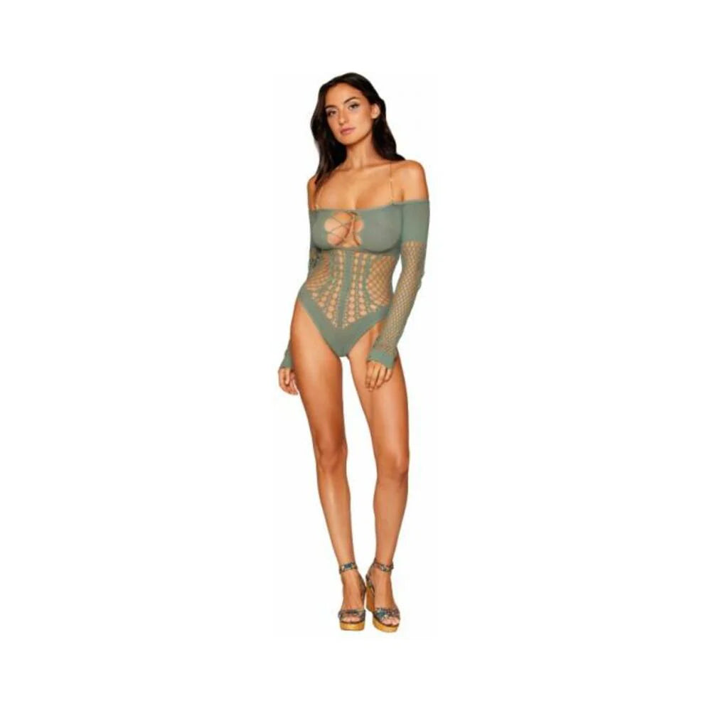 Long Sleeve Teddy Sage Green One Size from Dreamgirl Lingerie. Experience the allure of the Seamless Long Sleeve Teddy, blending intricate opaque and fishnet detailing alongside a captivating novelty pattern bodice, designed to mesmerize and flatter. Enhancing its elegance, this Teddy boasts a removable gold halter chain, offering versatility in styling options and adding a touch of sophisticated glamour to your look. The seamless construction ensures a sleek and comfortable fit, ideal for all day wear or intimate moments. The combination of long sleeves and novelty bodice pattern offers a unique and stylish aesthetic, perfect for making a bold statement in your lingerie collection. One size fits most. Ladies sizes. Sizes 2 to 14. Cups B/C. Bust 32 inches to 38 inches. Waist 24 inches to 32 inches. Hips 34 inches to 40 inches. Weights 90 pounds to 160 pounds. Categories: Lingerie, Clothing, Naughty Role Play, Teddy, Teddies. Restricted, Amazon Restricted. 2024.