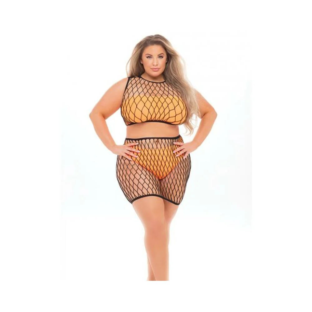 Pink Lipstick Crave You Large Fishnet Cami Top & Skirt, Bandeau Top & Panty . Queen. Bust: 43in.-50in. Waist: 34in.-42in. Hip: 44in.-52in. Cup: D/DD. Dress: 16-22.