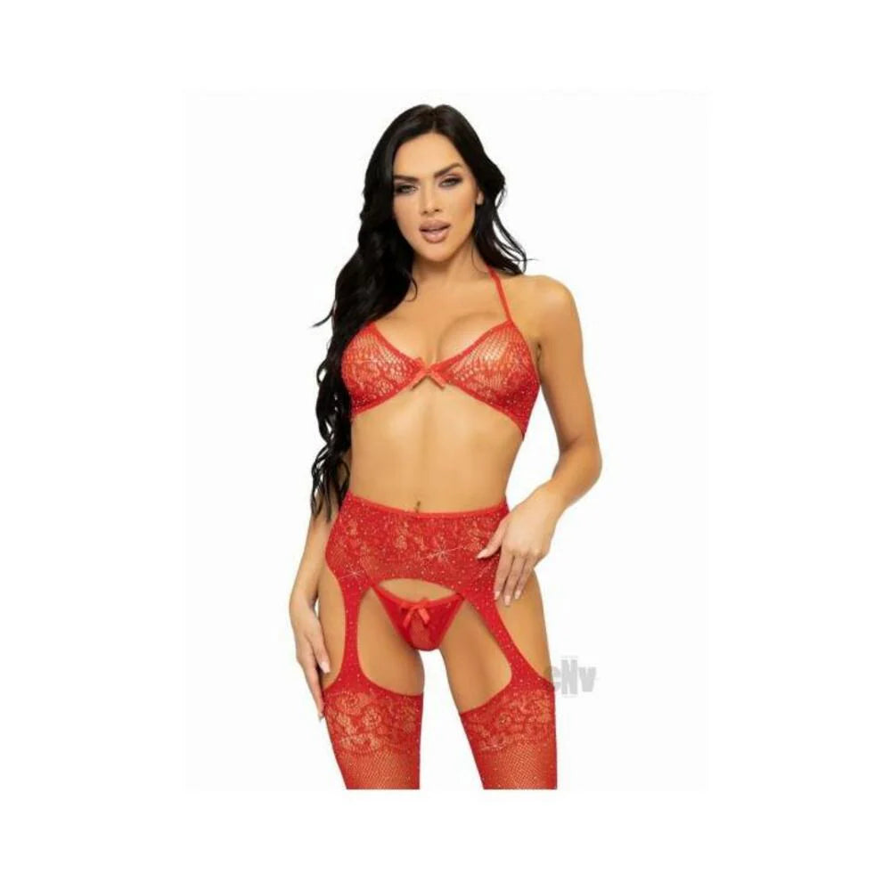 Rhinestone Bra Gstring Garter 3pc Os Red