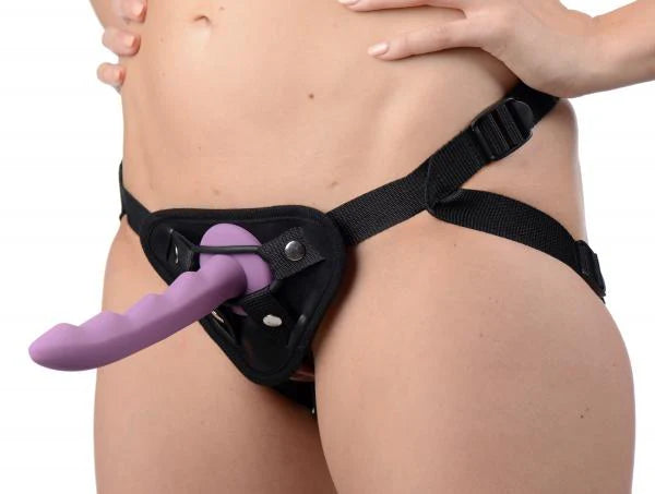 Take your strap on fantasies to a sexy new level with this fully adjustable and comfortable strap on harness from Strap U. With two straps designed to wrap around the back of the legs, it will leave your crotch open and fully accessible. Delight in the front cushion support, where you can insert your favorite flared base dildo. Just insert the dildo, snap the ring into place, tighten the straps, and you are ready! The waistband offers adjustable hip straps and will accommodate most sizes. This fun harness offers a more form-fitting design that hugs the contours of your body, allowing you to move freely. The harness also has a built in pocket in the front to hold a vibrating bullet or egg, for more excitement for the wearer. The soft material is washable and easy to maintain, making this a comfortable choice for all your strap on adventures! Measurements fits waists up to 62 inches. Ring measures 1.75 inches in diameter. Materials Nylon, Neoprene, ABS plastic, silicone. Color Black. Note fits dildos up to 1.75 inches in diameter, not included. Sold separately.