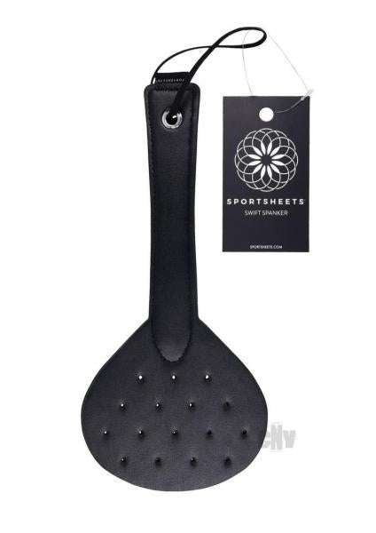 Seize control and ignite fresh excitement with the beguiling sensations and endearing smacks of the Swift Spanker. Perforated with holes scattered across the split tipped edge for reduced resistance and a satisfying smack strong enough to leave dotted patterns across the body. Use it to enact the perfect punishments or for pleasurable pats with swift accuracy to keep your partner on edge with anticipation. 11.5andrdquo; long paddle with looped handle Perforated for less air resistance with each swing Split tip faux leather spanker