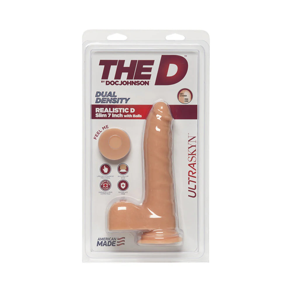 The Realistic D, one of the most lifelike cocks in the line, adds an exceptional range to The D collection with options in slim and regular widths. Dual density ULTRASKYN™ warms to the touch and is designed with a soft exterior and firm core to emulate the feel of a real penis. • Dual Density Design Feels Real • Slim Design, Lifelike Detail • Soft, Plush Exterior and Firm Inner Core • Suction Cup Base for Added Stability • O-Ring Harness Compatible • Handcrafted from ULTRASKYN™, for The Ultimate Feel • Phthalate-Free, Body-Safe • Proudly Made in America
