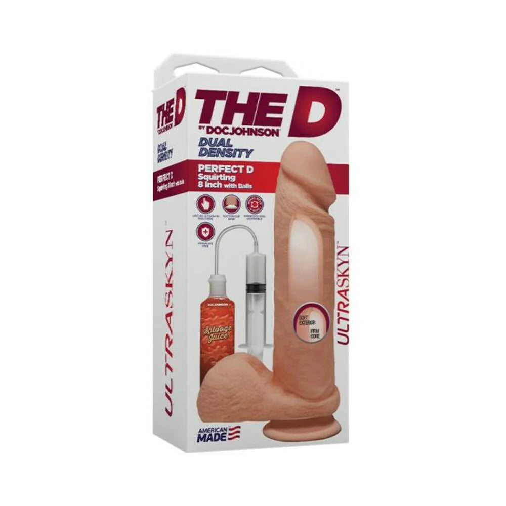 Everybody wants it! Molded from a real erect penis, the lifelike texture and proportions of the dual density ULTRASKYN Perfect D 8-Inch offer the most realistic look and sensation imaginable. The Perfect D is handcrafted to form the ideal balance between the soft, plush exterior and firm inner core that makes this collection so unique, and warms to body temperature with use. A strong suction cup base that affixes to most flat surfaces allows hands-free use, completing the realistic experience. The Squirting D comes with a 1 oz. bottle of Splooge Juice and squirts on command with handheld syringe.