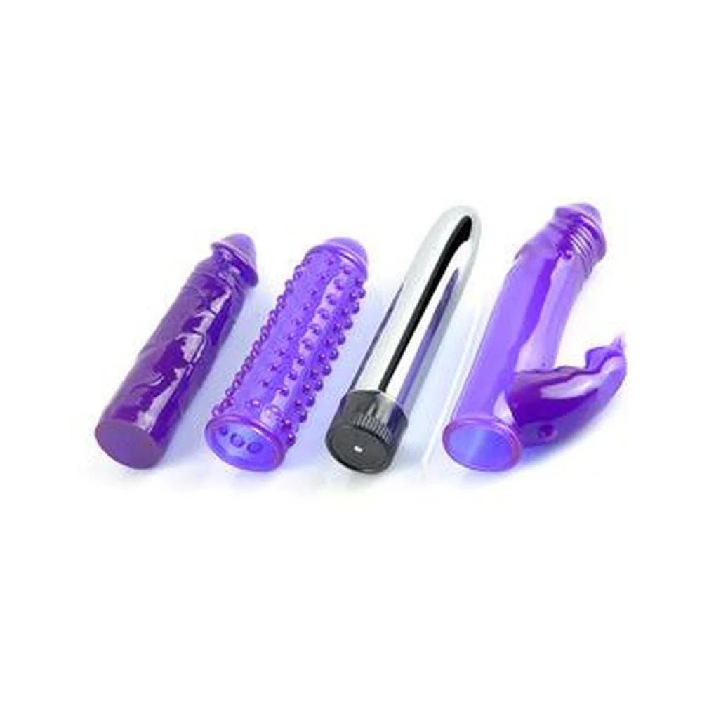 Let purple reign! The Royal Rabbit Kit includes seven magnificent items of pure gratifying pleasure. The multi-speed, silver vibe and two sleeves will satisfy your deepest yearnings. Try the translucent dong for the feel of realistic sexual enjoyment. Place the textured cockring on your lover and the sensation will tickle and excite your vagina and clitoris with each thrust. The graduated anal beads bring erotic taboo excitement while the thrill balls can tantalize your vagina or anus for a little something different. Vibrator requires 2 C batteries, not included.