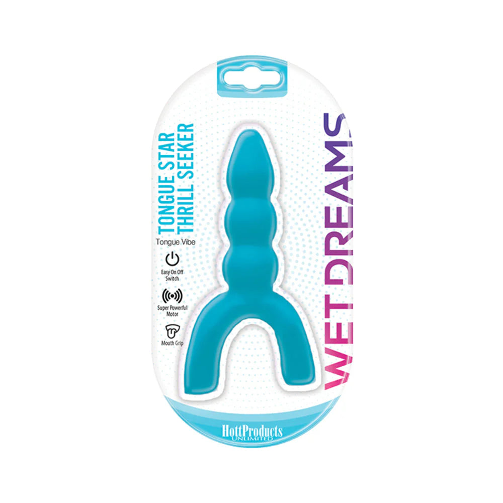 Wet Dreams Tongue Thrill Seeker Tongue Vibe with Pleasure Ribs Blue from Hott Products. Features an easy on off switch. Super powerful motor. Mouth grip.