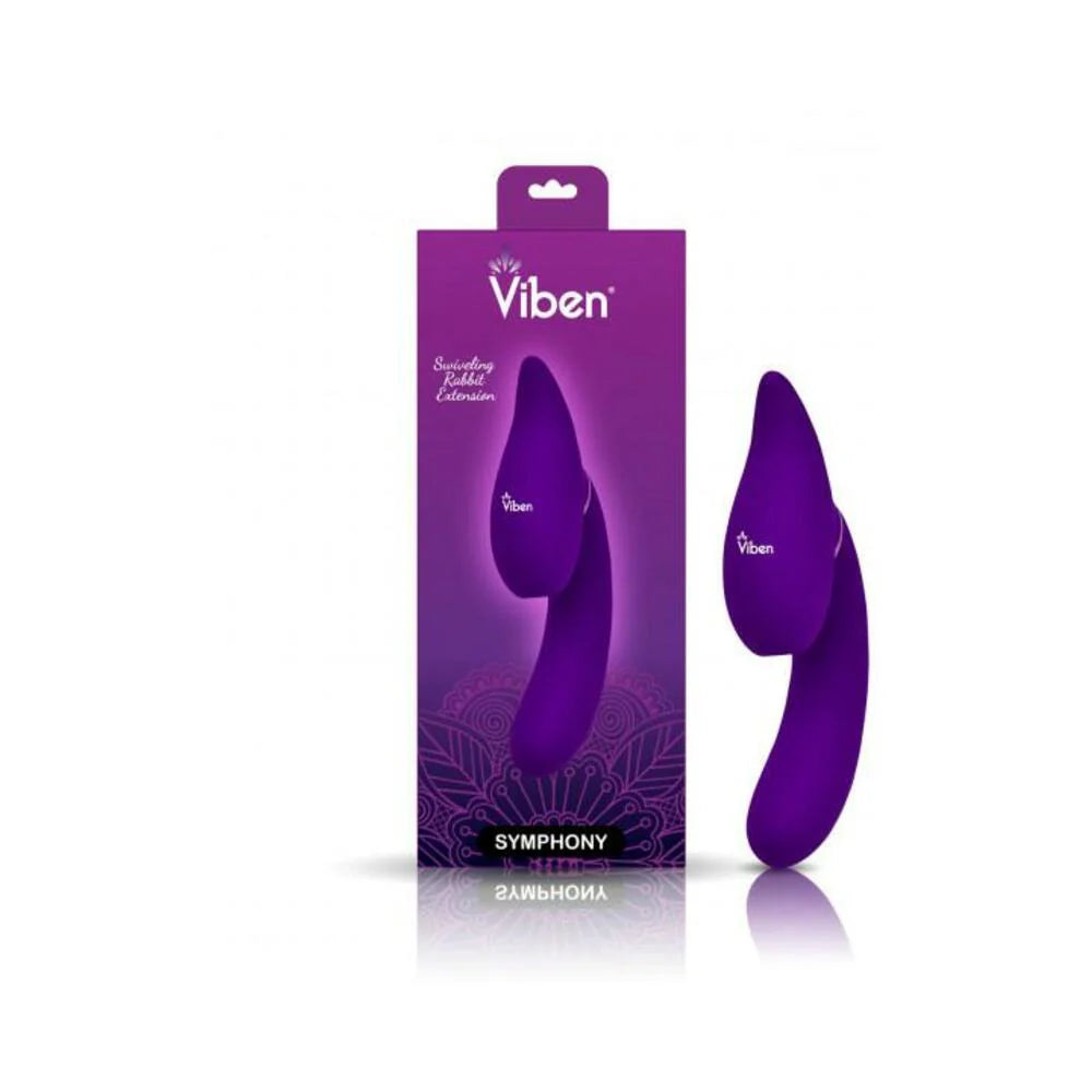 Viben Symphony Insertion Triple Motor Vibe Violet. Elevate your intimate experience to a crescendo of pleasure with Vibens Symphony. This uniquely designed Vibrator, features a swiveling extension that can be used for either Clitoral vibration or suction. Featuring 3 powerful speeds and 7 intense patterns in 3 different astounding motors. Created of silky smooth silicone, explore a range of sensations, from delicate caress to intense breathtaking peaks. A masterpiece that harmonizes insertable vibration, clitoral stimulation and suction to create a symphony of pleasure that resonates with your every desire. Vibens Symphony is perfect for solo or couples play. USB rechargeable and waterproof, available in a beautiful bold purple, Violet. Features: 7 Intense Vibration Patterns. 3 Powerful Speeds. Clitoral Suction and Vibration. Stimulator. Splashproof. Premium Silicone. USB Rechargeable. Weight: .25 pound. Circumference: 4.12 inches. Width: 1.34 inches. Length: 7.28 inches. UPC: 810080750098. Categories: Vibrators, Clitoral, Eco-Friendly Sex Toys, Rechargeable Vibrators, Sex Toys for Women, Clit Cuddlers. 2024.