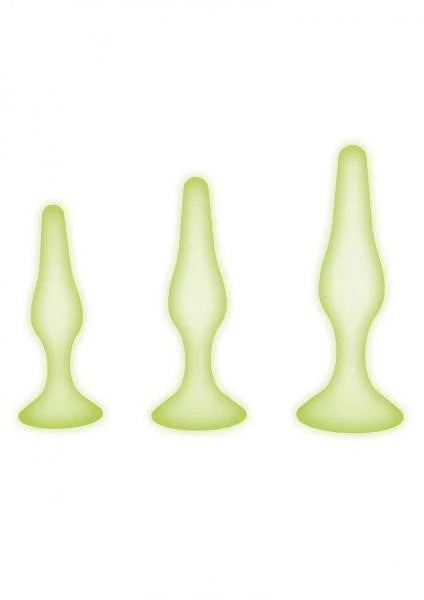 This set includes three gradually larger butt plugs to explore backdoor play at a range of levels. The slim, tapered tips on these butt plugs make them easy to for anal training and for anal play experts alike.