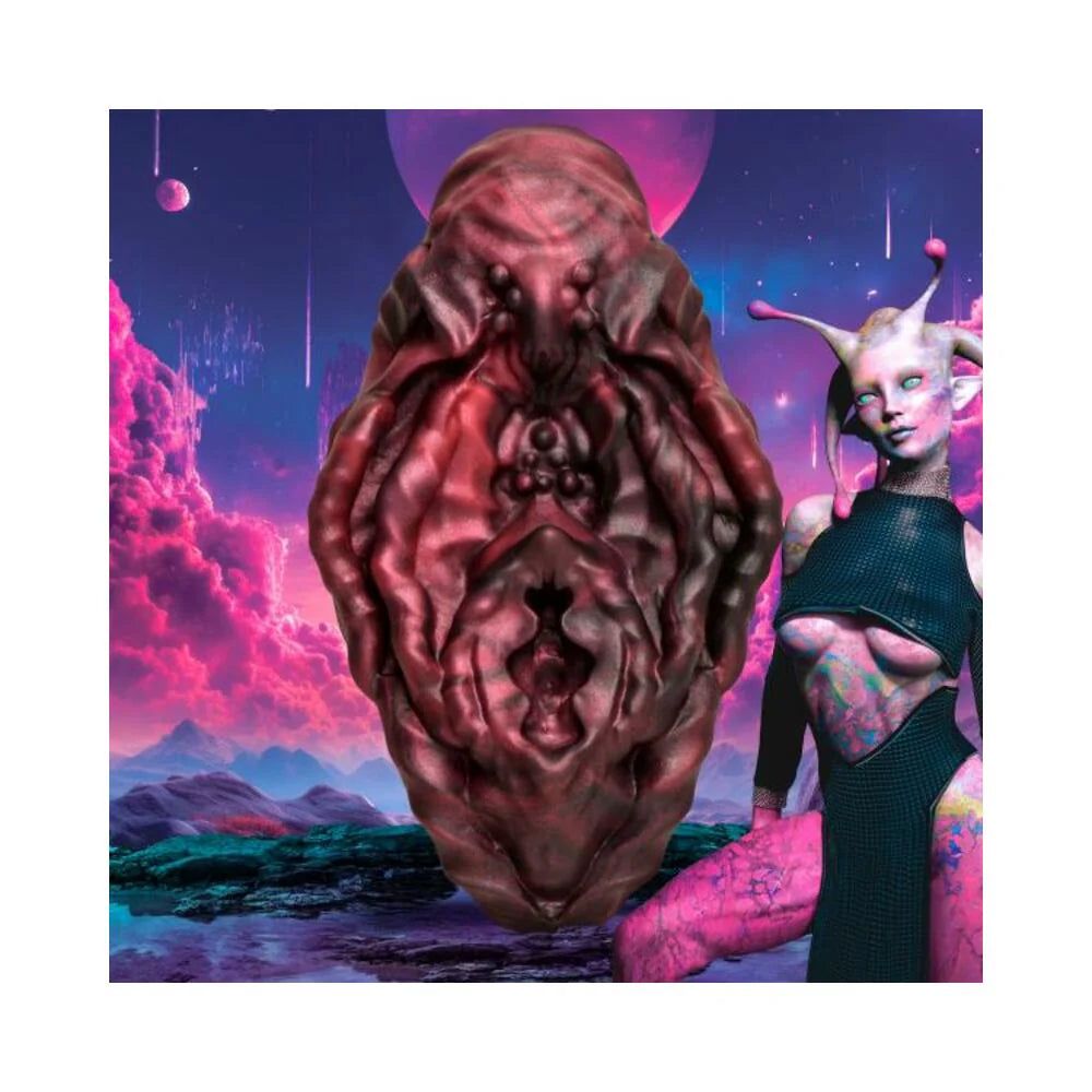 Rub against the textured, squishy, uniquely designed alien vulva and enjoy non-penetrative pleasure that can still take you over the edge of pleasure! For those who love direct stimulation against their erogenous zones but want a little more than the fingers and hands, this red and black Xeno vulva is designed with small beads, bumps, grooves and valleys that catch the lube and let you slip against it in passionate grinding! Made especially with vulva-owners in mind, it can also be a fun and sensual toy used against the nipples, balls, or shaft. Let your fantasies run wild as you imagine your erotic rendezvous with alien creatures! Place the grinding toy on chairs, couches, vibrating toys or in the palm of your hand to enjoy! To clean, wash with warm water and mild soap and then rinse, spray with a toy cleaner and pat dry. Store separately from other silicone toys and out of direct heat or sunlight. Use only with water-based lubricants. You open your eyes to find you're in a warm cavern with low, red lights. Your wrists and ankles are tied together. As your vision clears, you see someone standing in the distance. Wait, no… it isn't someone… it's something! They walk closer and you see this red and black creature, a humanoid with flitting insect wings, large black eyes, and a slim, feminine body. They walk up to you on long, slender legs, and then crouch over you. You can see your reflection in their deep, shining, black eyes. Their narrow face opens and a long tongue reaches out to lick and taste your face. It tickles and feels oddly pleasant… Their hand reaches out to caress your face and the touch is gentle. They touch the ropes connecting your ankles and they simply dissolve into nothing. Your eyes widen as they lower their head between your thighs and begin licking you! It feels so good you begin to moan. Then they slide between your thighs, and begin to rub their own alien vulva against you. Their slick, viscous slime gets all over you and it begins to warm you up. Before you know it you're grinding against them too, lost in a fever of passion and lust! Measurements : Overall length: 4.1 inches. Overall width: 2.3 inches. Overall height: 1.2 inches. Materials : Silicone Color : Red, black Note : Use only with water-based lubricants.